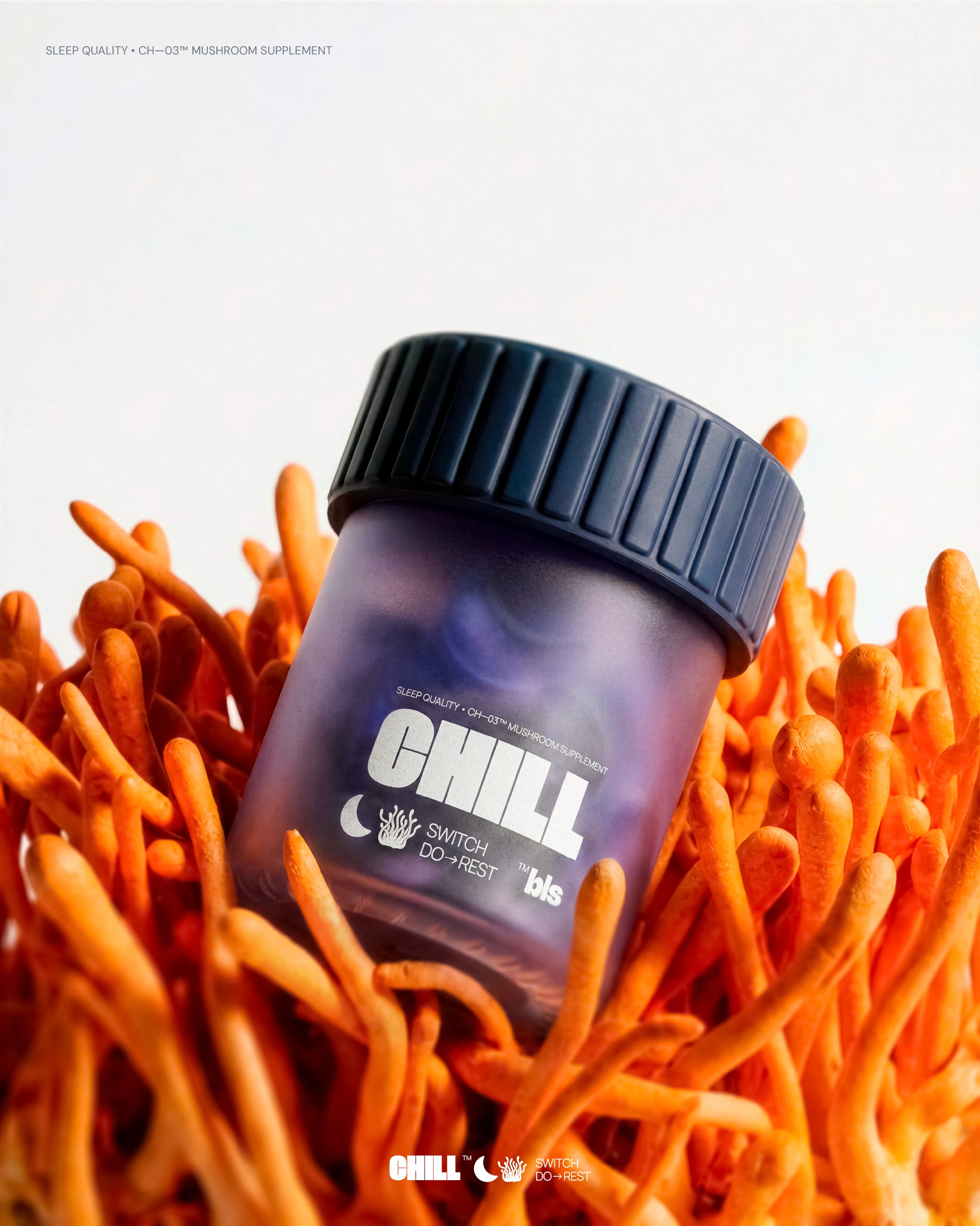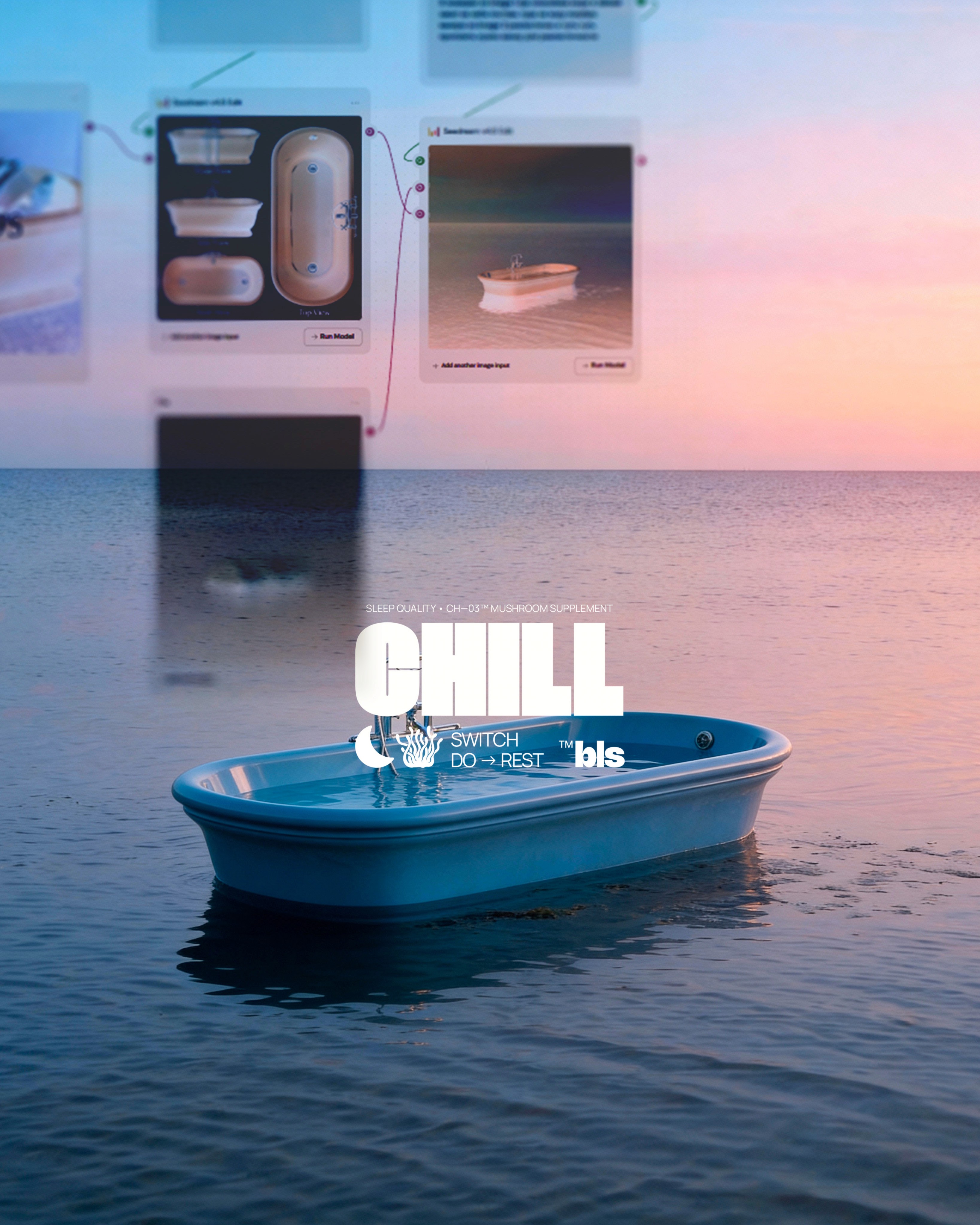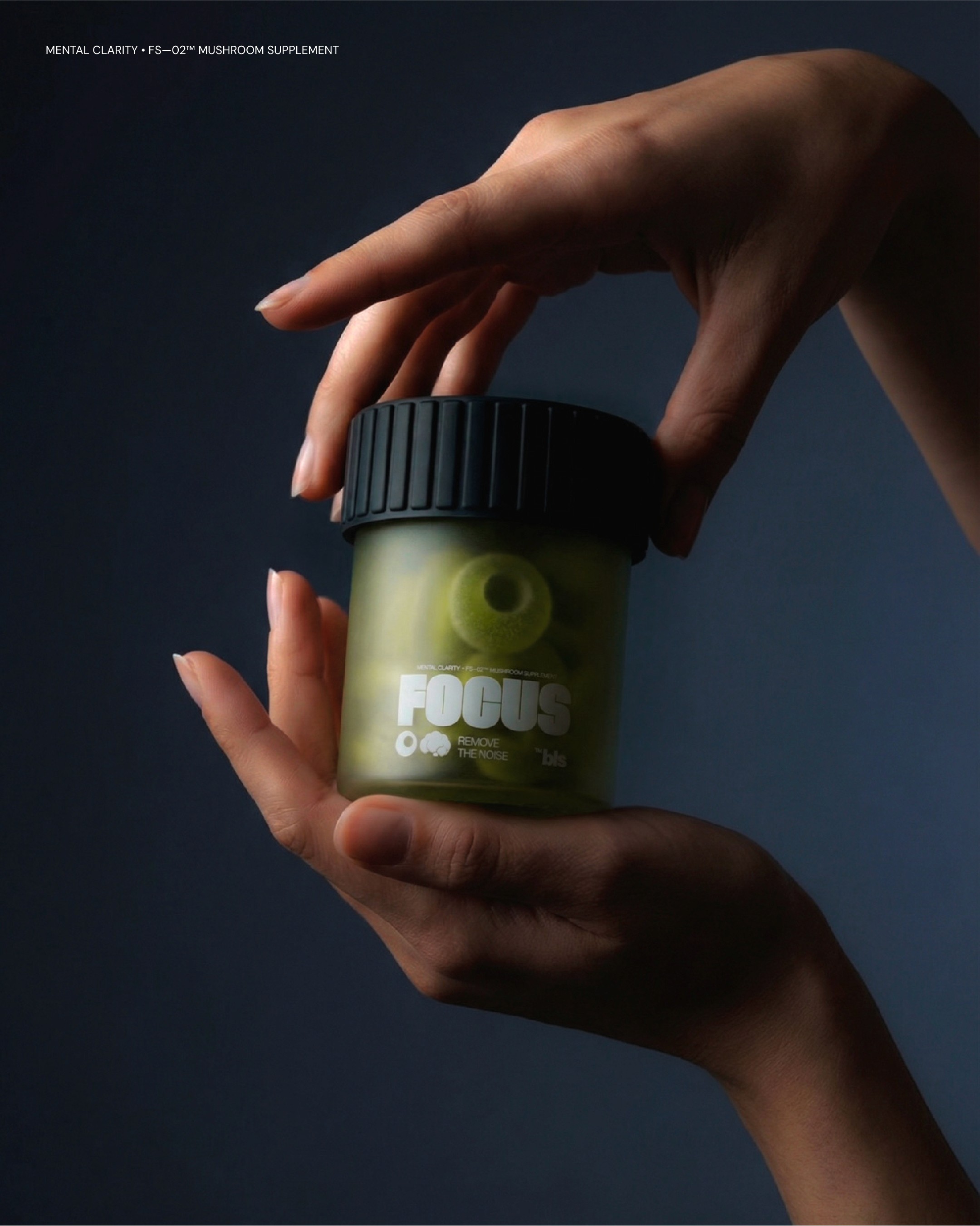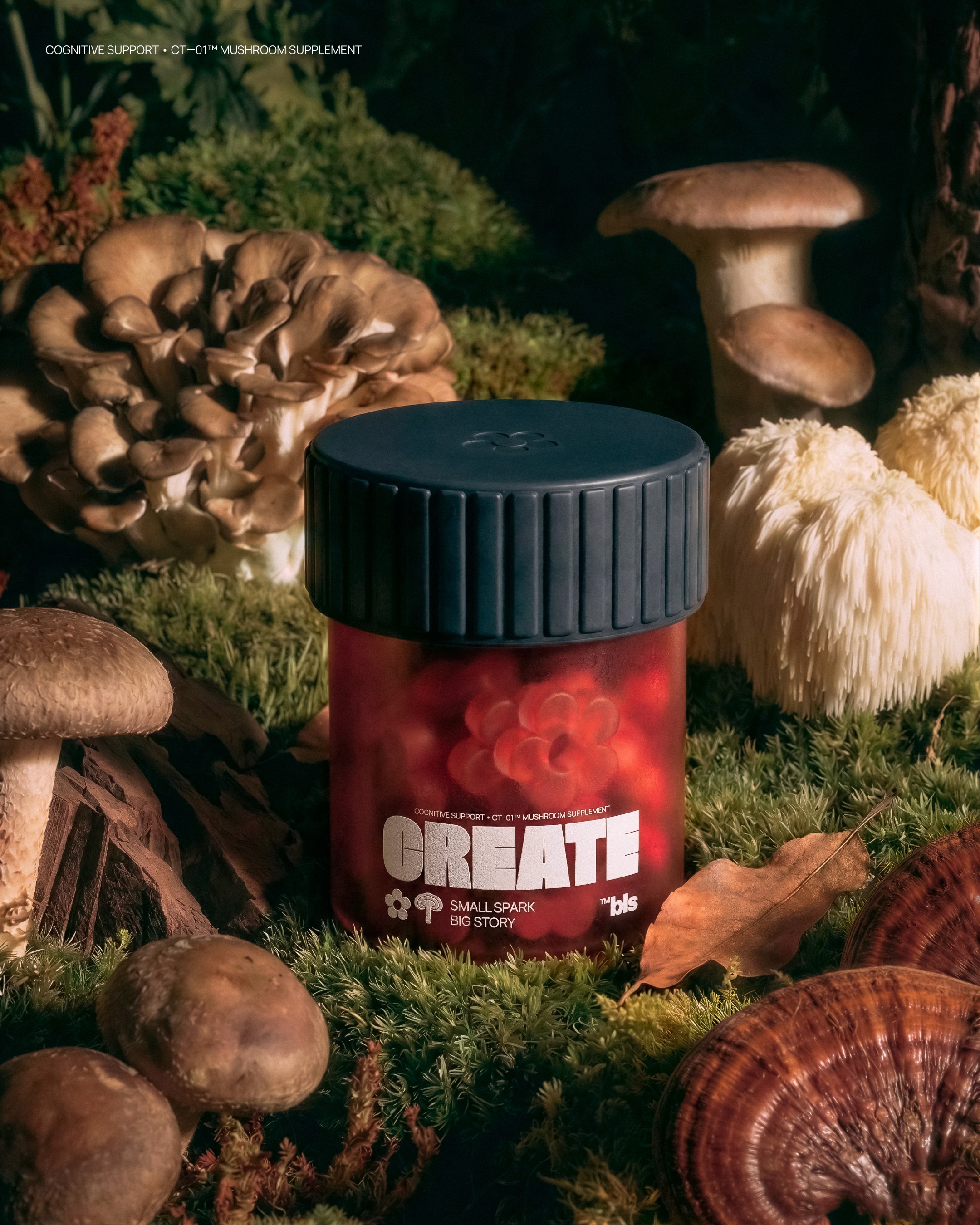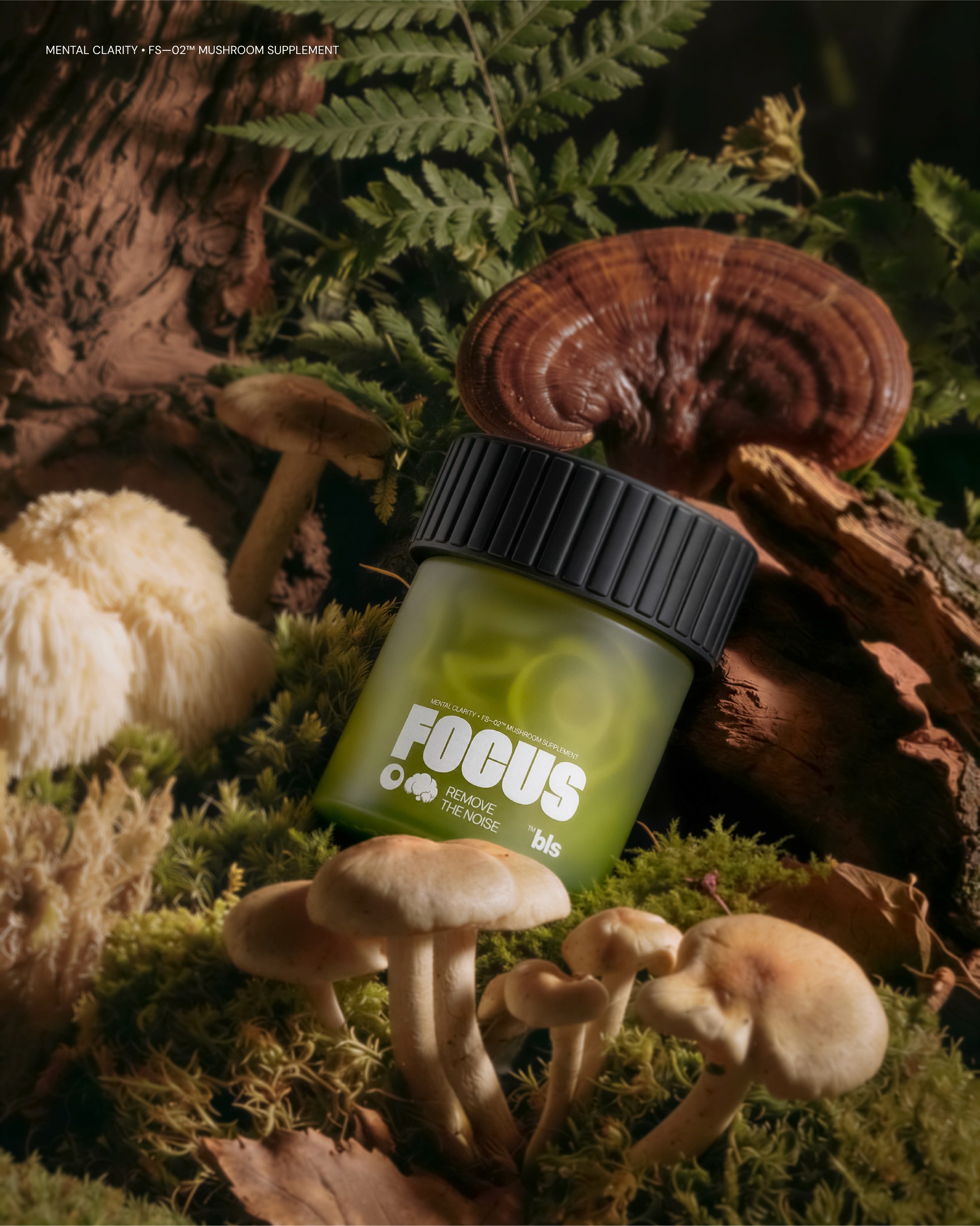 Within the Bless framework, we developed a line of nutraceuticals based on functional mushrooms, targeting key cognitive states such as Inspiration, Deep Focus, and Relaxation. Our visual concept traces the path from raw physical ingredients to associative imagery, helping the user intuitively understand the product's impact. We are open to feedback from the creative community that shares the values and mission of the Bless brand.