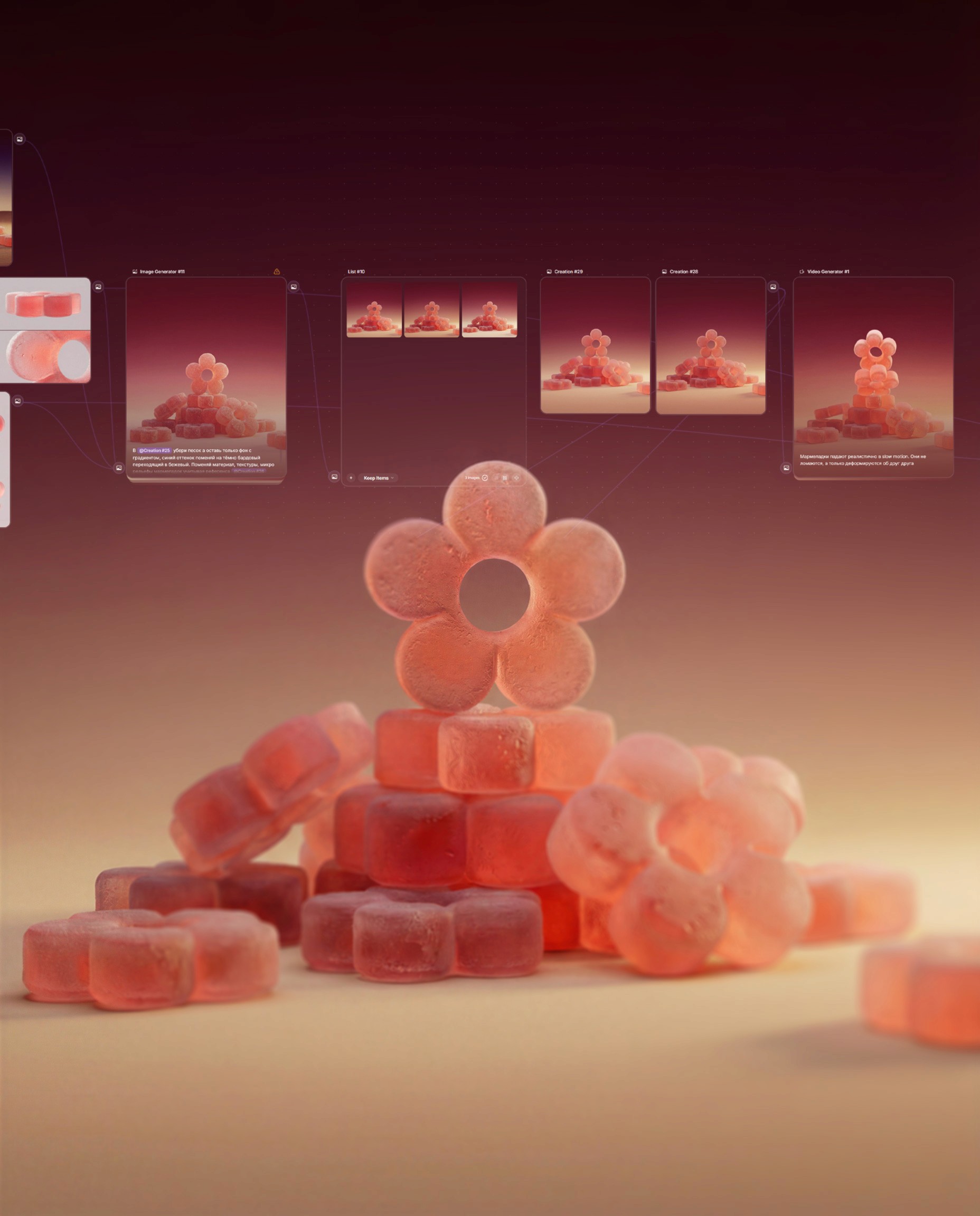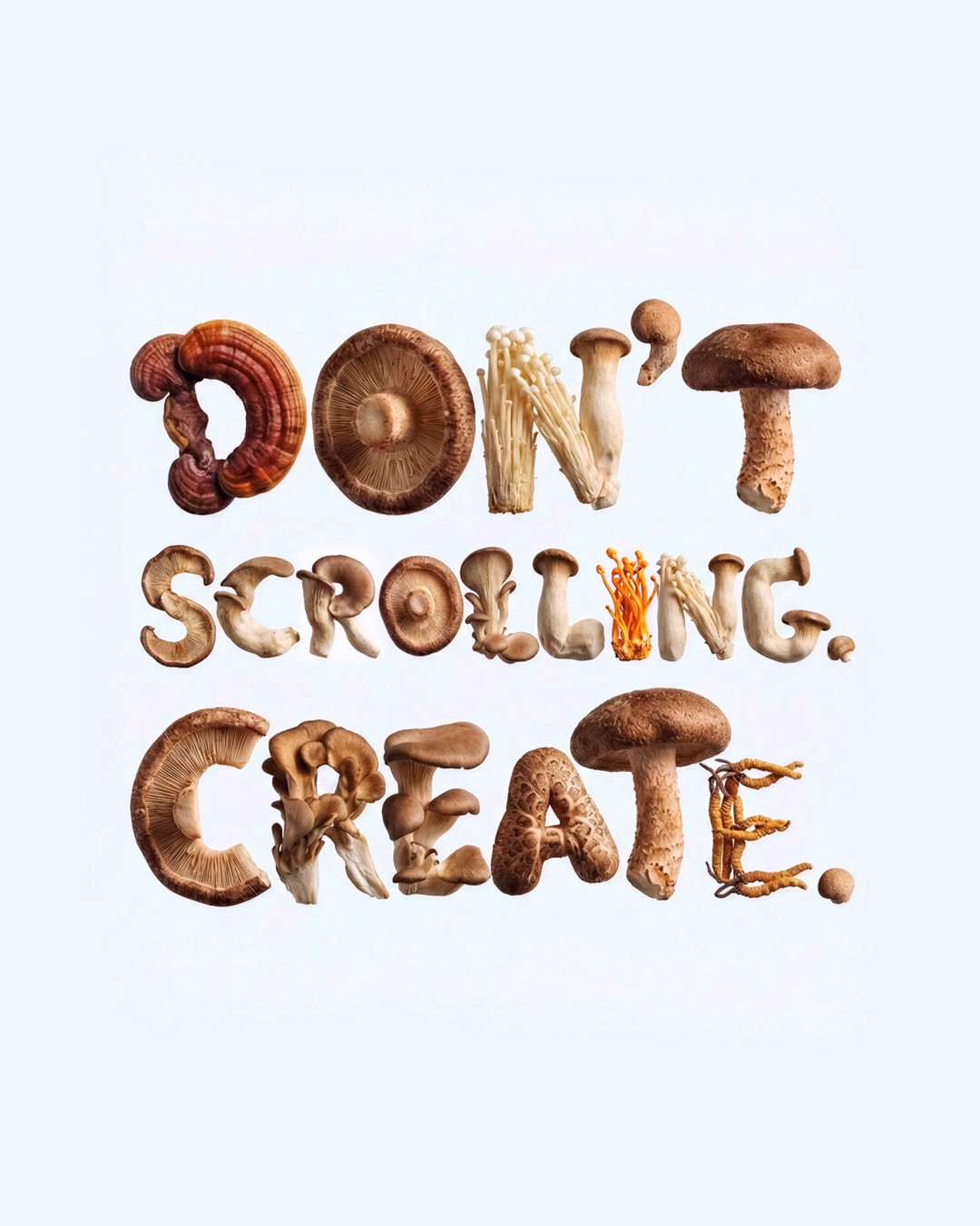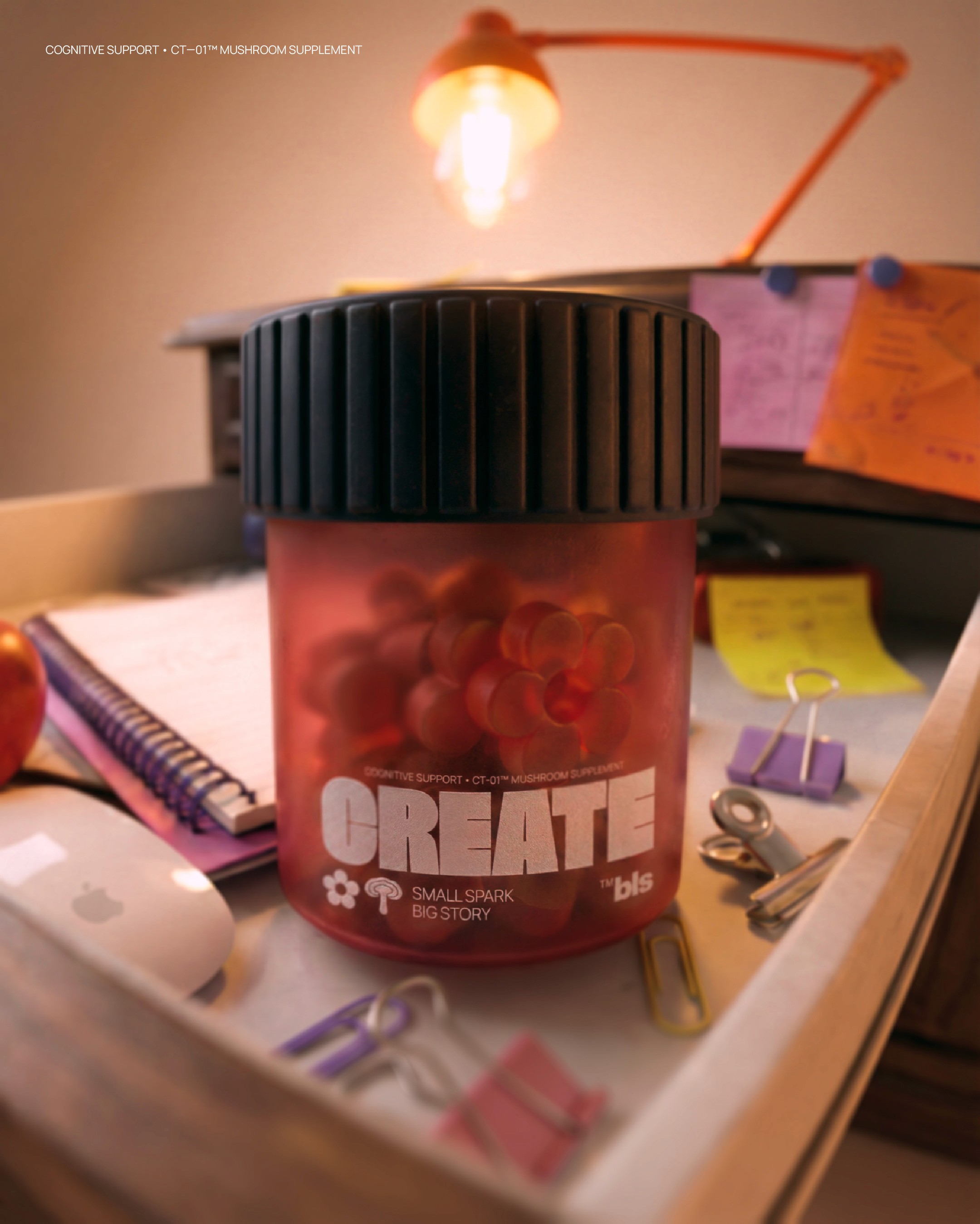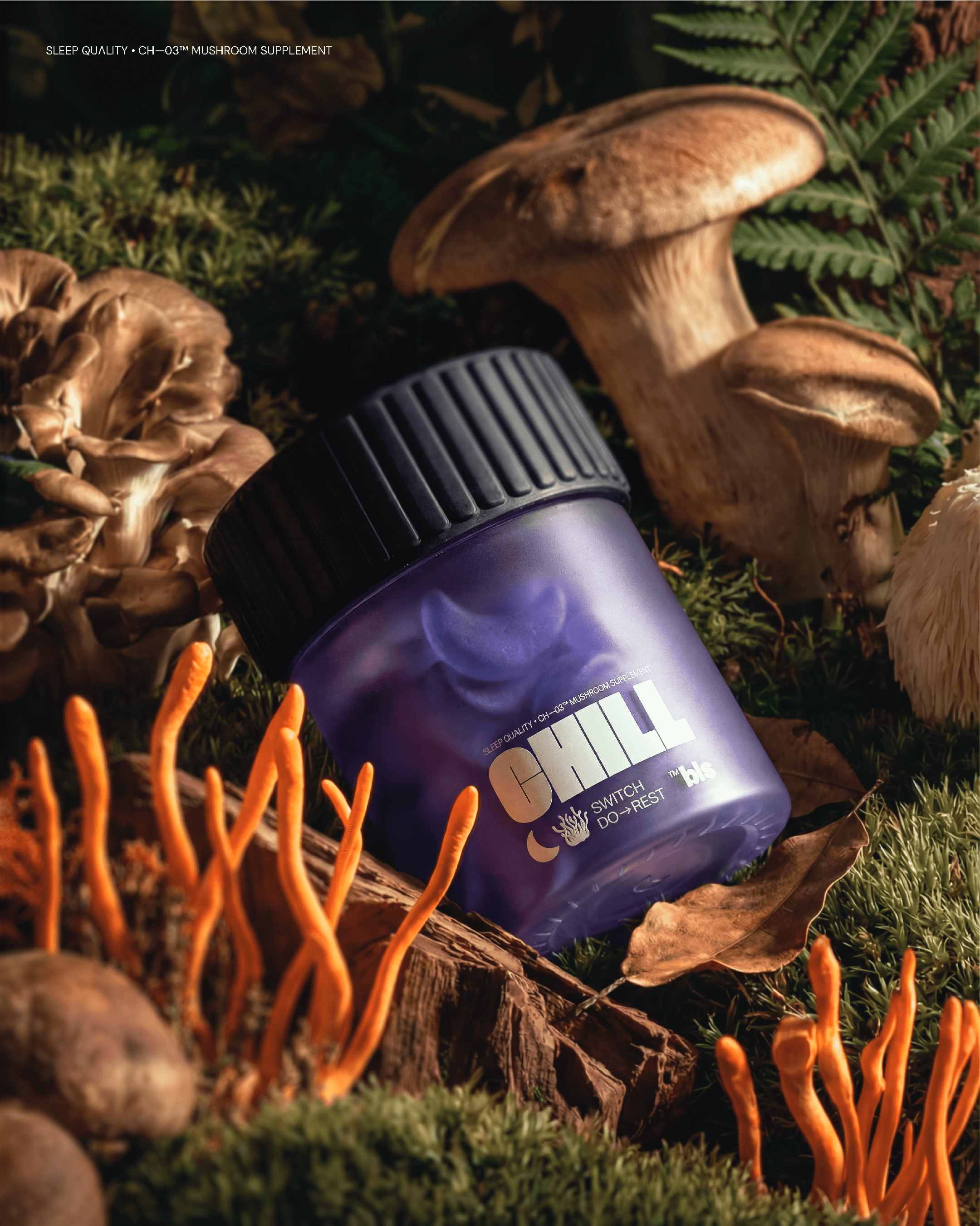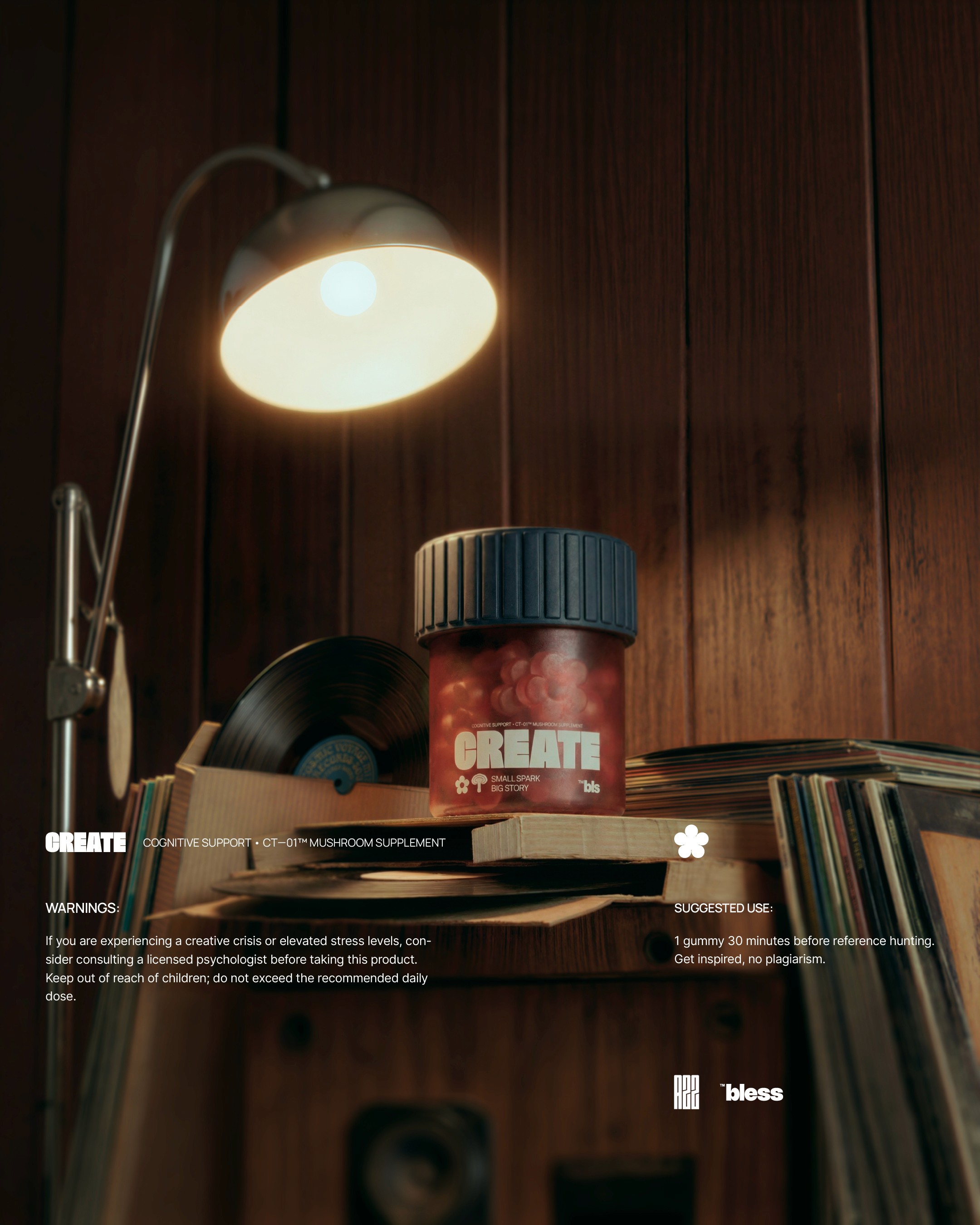 Within the Bless framework, we developed a line of nutraceuticals based on functional mushrooms, targeting key cognitive states such as Inspiration, Deep Focus, and Relaxation. Our visual concept traces the path from raw physical ingredients to associative imagery, helping the user intuitively understand the product's impact. We are open to feedback from the creative community that shares the values and mission of the Bless brand.